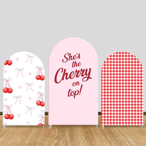 JY665 Cherry Bow Red White Gingham Arch Backdrop Cover, Elastic Fabric Arch for Girls Birthday, Sweet Party Decoration