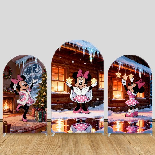 JY1204 Minnie Mouse Log Cabin Christmas Arch Backdrop Cover, Elastic Fabric Background for Winter & Festive Party