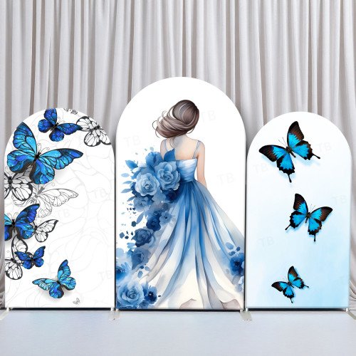 JY25 Blue Butterfly Bride Back View Arch Backdrop Cover Elastic Fabric Elegant Wedding Themed Party Decoration for Bridal Shower Anniversary