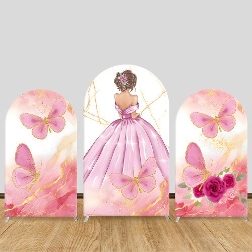 JY444 Pink Gold Butterfly Arch Backdrop Cover, Elastic Fabric Arch Backdrop Stand Cover for Wedding Bridal Shower, Elegant Lady Rose Photo Backdrop for Birthday Party Decor