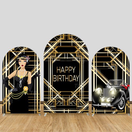 JY715 Great Gatsby Black Gold Birthday Arch Backdrop Cover, Elastic Fabric Arch for Adult Birthday, Roaring 20s Party Decoration