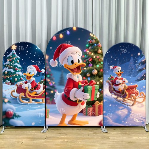 JY897 Donald Duck Christmas Sleigh Gift Arch Backdrop Cover, Elastic Fabric Arch for Christmas Party, Winter Holiday Decoration