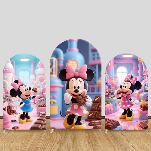 JY923 Minnie Mouse Chocolate Factory Arch Backdrop Cover, Elastic Fabric Arch for Kids Birthday, Sweet Treat Party Decoration