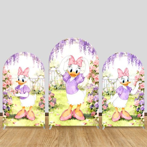 JY972 Daisy Duck Watercolor Garden Arch Backdrop Cover, Elastic Fabric Arch for Girls Birthday, Whimsical Floral Party Decoration