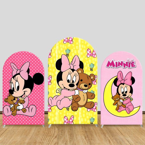 JY985 Baby Minnie Mouse with Teddy Bear Arch Backdrop Cover, Elastic Fabric Arch for Baby Shower, Pink Yellow Party Decoration