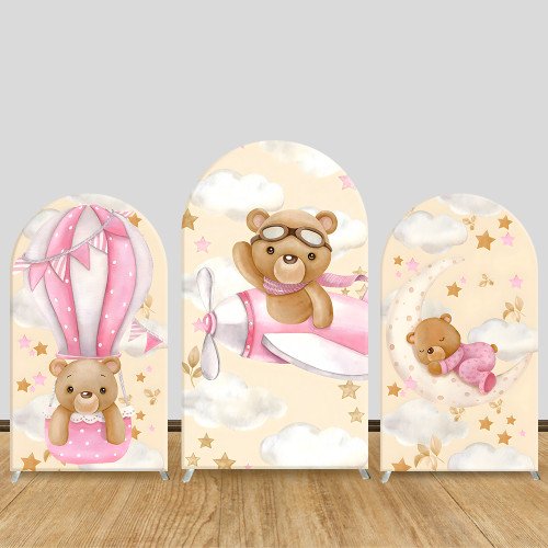 JY1012 Pink Teddy Bear Airplane & Hot Air Balloon Arch Backdrop Cover, Elastic Fabric Arch for Baby Shower, Girl Party Decoration