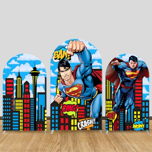 JY1021 Superman City Comic Arch Backdrop Cover, Elastic Fabric Background for Boys Birthday & Superhero Party