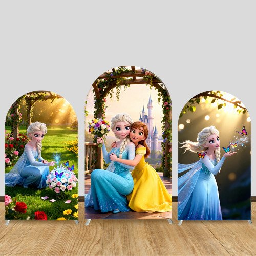 JY1102 Frozen Elsa & Anna Garden Castle Arch Backdrop Cover, Elastic Fabric Background for Girls Birthday & Sister Party