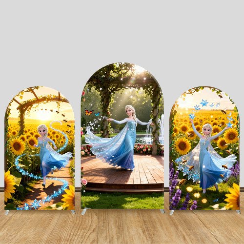 JY1107 Frozen Elsa Summer Sunflower Garden Arch Backdrop Cover, Elastic Fabric Background for Girls Birthday & Magical Party