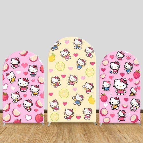JY1116 Pixel Art Hello Kitty with Fruits Arch Backdrop Cover, Elastic Fabric Background for Girls Birthday & Cute Themed Party