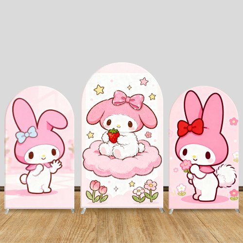 JY1130 My Melody with Strawberry & Cloud Arch Backdrop Cover, Elastic Fabric Background for Kids Birthday & Cute Themed Party