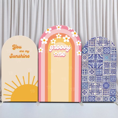JY34 Retro Sunshine Daisy Arch Backdrop Cover Elastic Fabric Groovy Boho Baby Shower Decoration