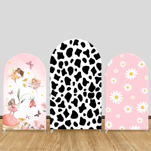 JY434 Fairy Cow Print Arch Backdrop Cover, Elastic Fabric Arch Backdrop Stand Cover for Wedding Birthday Party, Pink Daisy Flower Photo Backdrop for Baby Shower Event Decor